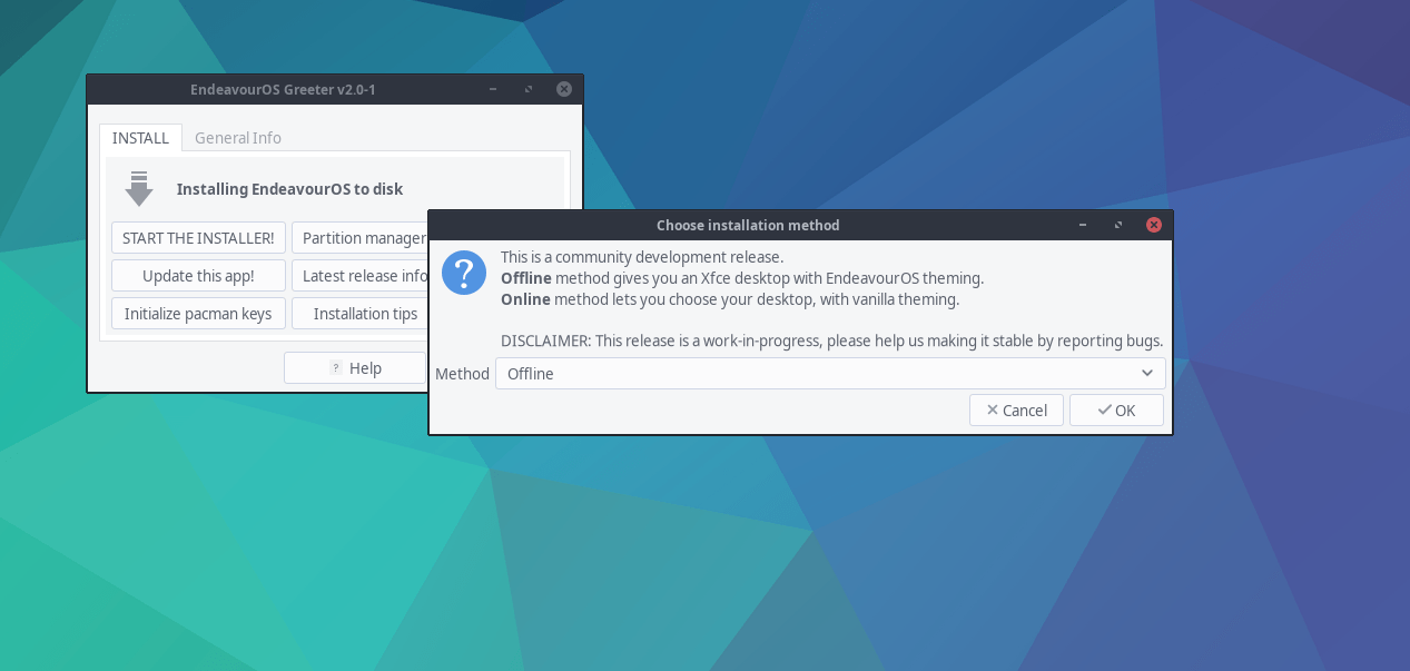 We are using the Calamares installer and when you are starting your install by clicking on the Start the installer button of the Welcome app, it asks you which install you prefer: Offline or online.