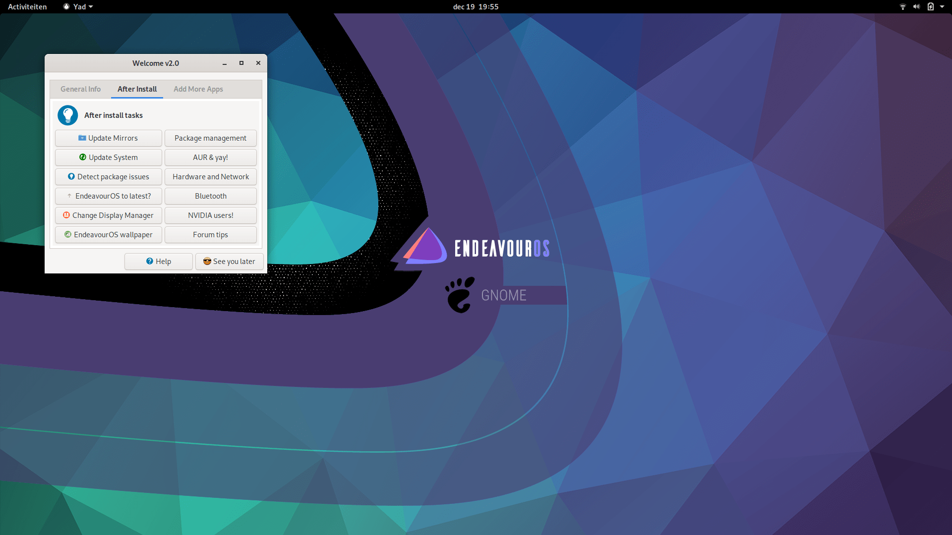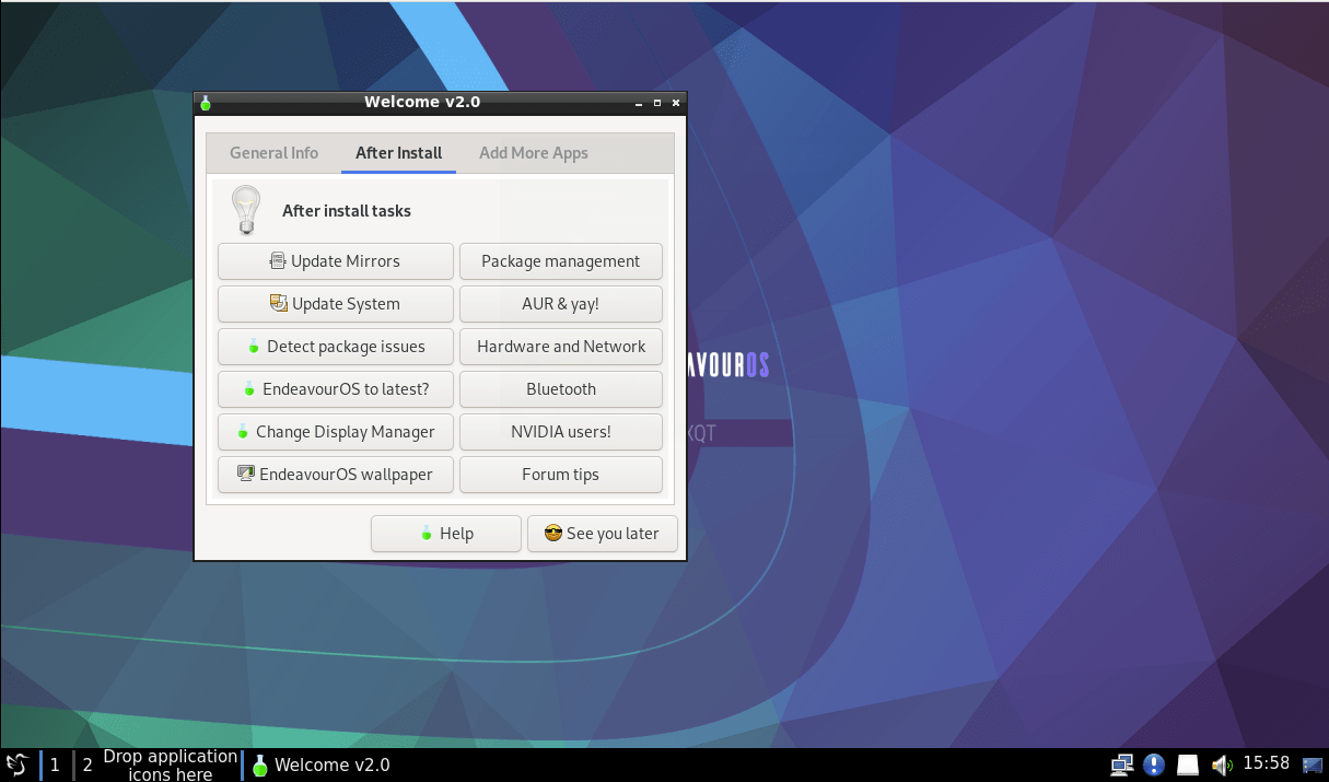 No matter which Desktop Environment you choose, EndeavourOS ships with some preinstalled packages and apps you already know from our current installer and some of those are: Grub, the mainstream Linux-kernel, Nano, broadcom-dkms, intel-ucode/amd-ucode, Nvidia-installer, arc-x-icons-theme, eos-welcome, eos-update-notifier, reflector-auto, Yay and Firefox.